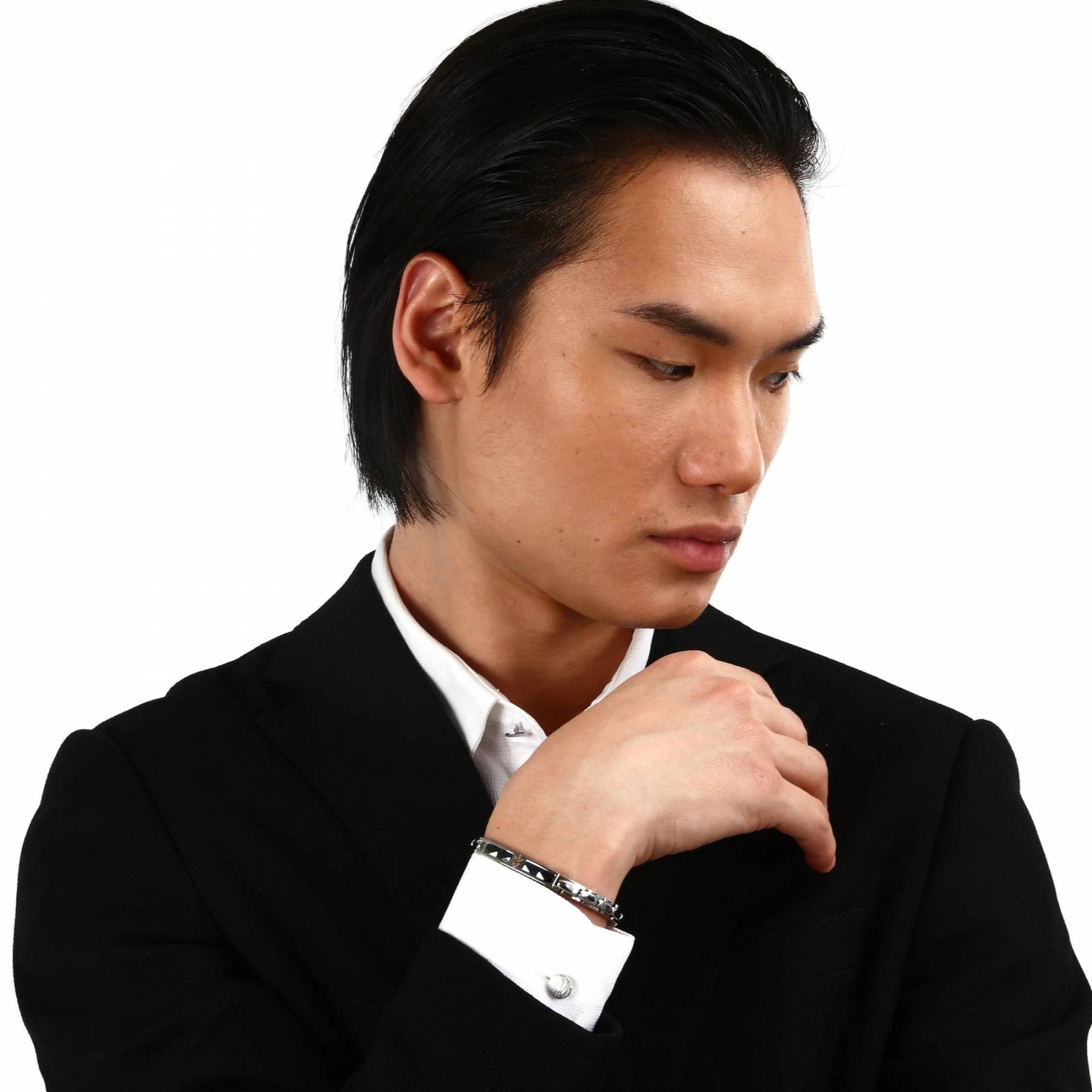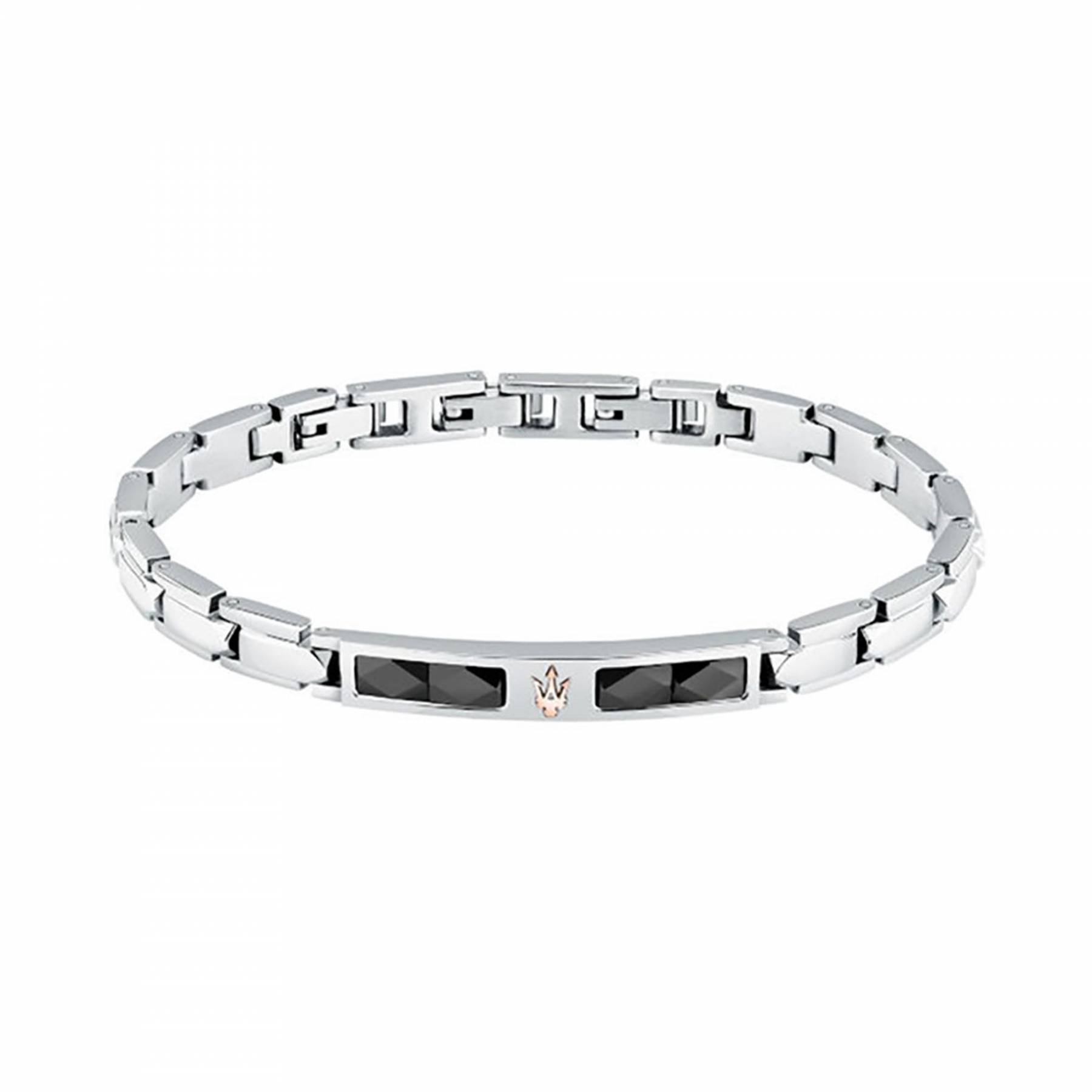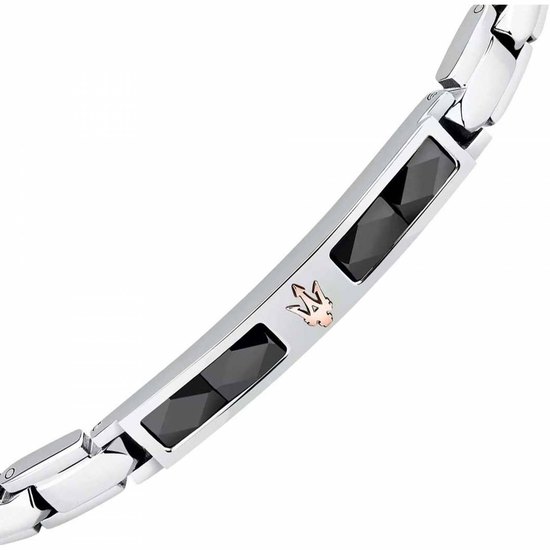 Ανδρικό βραχιόλι MASERATI από ανοξείδωτο ατσάλι με κεραμικά στοιχεία. To βραχιόλι είναι ασημένιου και μαύρου χρώματος με σχέδιο ροζ χρυσή τρίαινα.