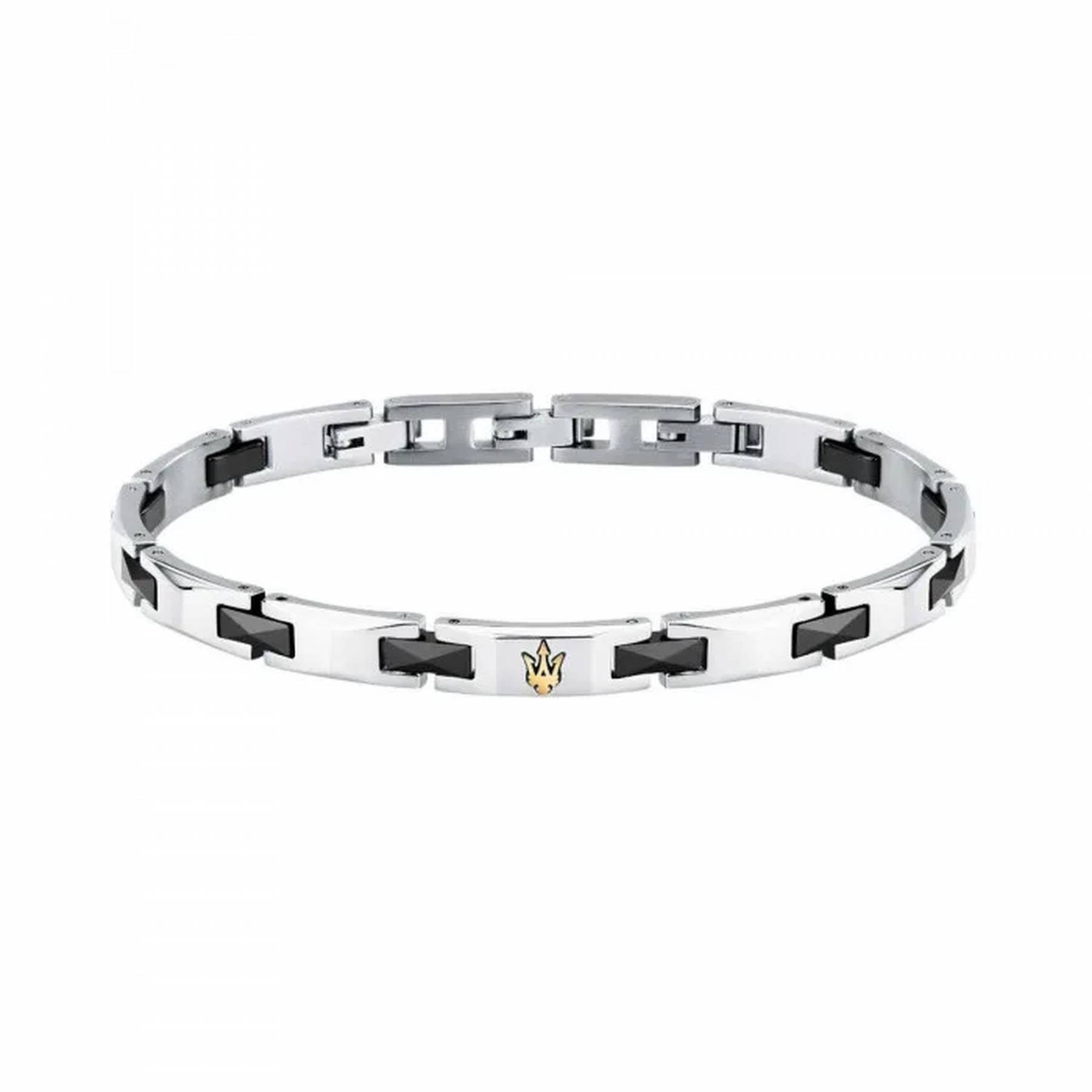 Ανδρικό βραχιόλι MASERATI από ανοξείδωτο ατσάλι με κεραμικά στοιχεία. To βραχιόλι είναι ασημένιου και μαύρου χρώματος με σχέδιο χρυσή τρίαινα.