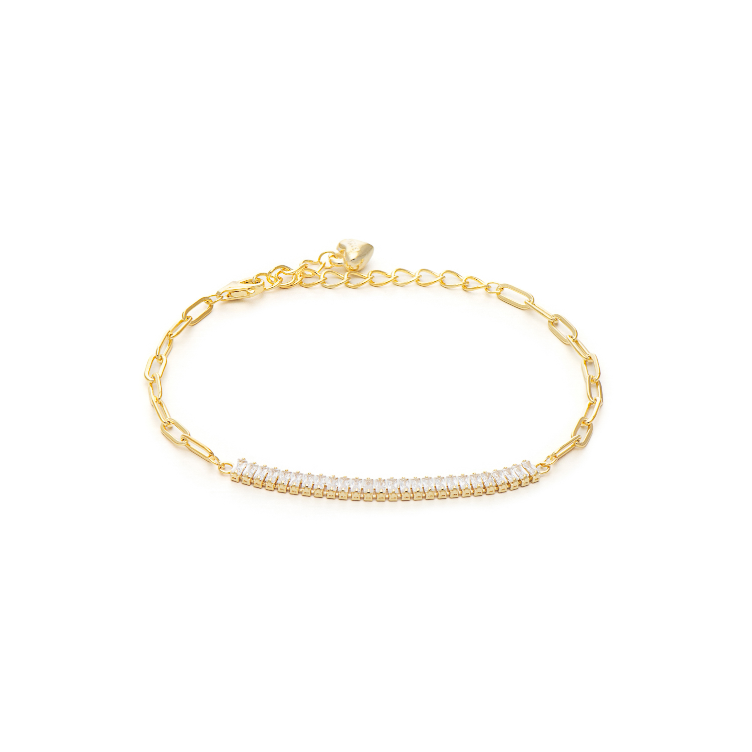 Κομψό ασημένιο βραχιόλι σε κίτρινο χρώμα με λευκές πέτρες ζιργκόν. Ένα διαχρονικό σχέδιο που συνδυάζει απλότητα και ρομαντισμό.