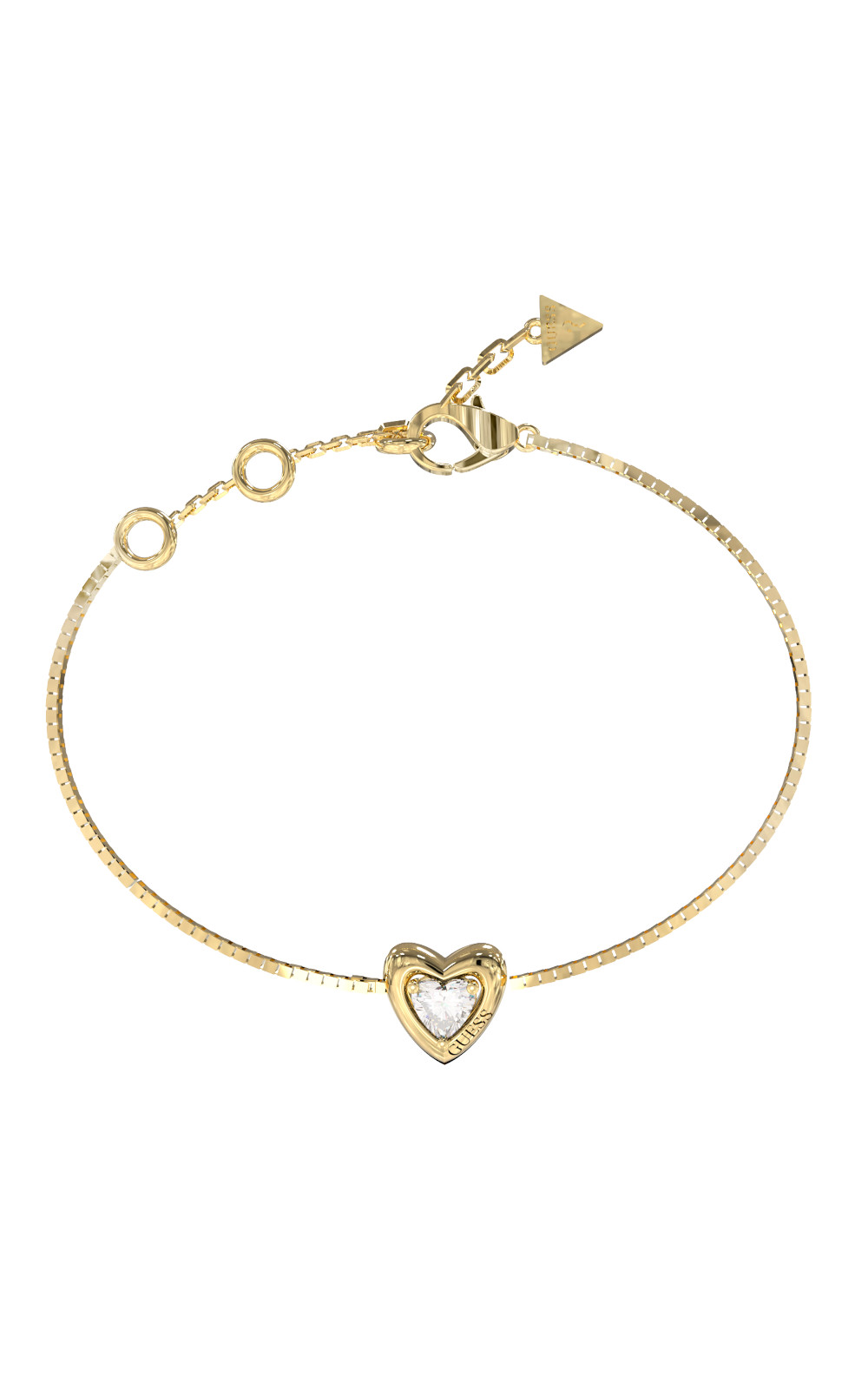 Γυναικείο βραχιόλι GUESS STEEL χρυσού χρώματος. Έχει σχέδιο με καρδιά με πέτρα και λογότυπο(21cm).