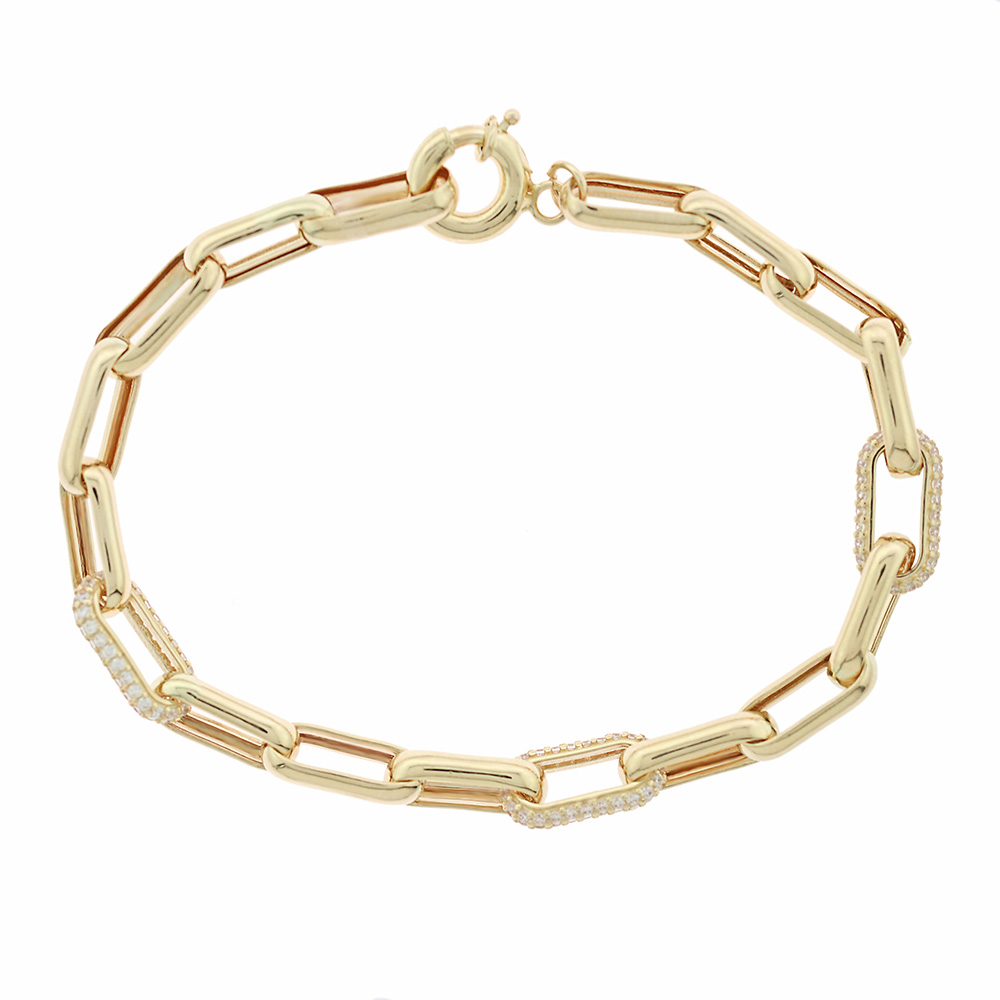Εντυπωσιακό χρυσό βραχιόλι με μοντέρνα αλυσίδα από επιμήκεις κρίκους, που συνδυάζει αρμονικά τη διαχρονική κομψότητα με τη σύγχρονη αισθητική. Ορισμένοι κρίκοι είναι διακοσμημένοι με λαμπερά ζιργκόν, προσθέτοντας διακριτική λάμψη και πολυτέλεια στο κόσμημα. Διαθέτει ασφαλές κούμπωμα για άνετη και σταθερή εφαρμογή.