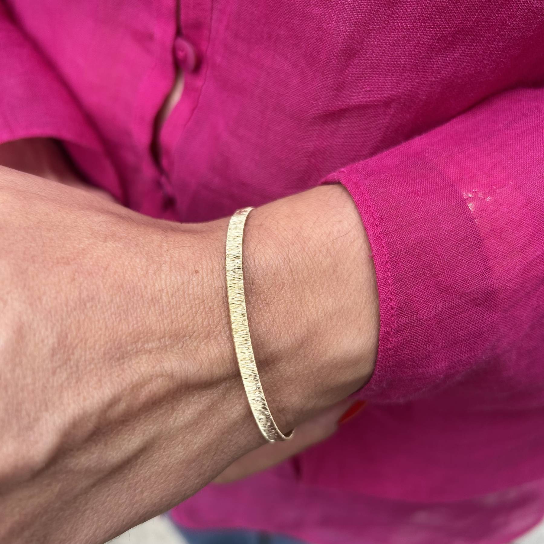 Αναδείξτε τη διακριτική κομψότητα με αυτό το εκλεπτυσμένο βραχιόλι από χρυσό 14 καρατίων. Με καθαρές γραμμές και ματ υφή, αποτελεί ιδανική επιλογή για γυναίκες που αγαπούν το minimal στυλ και τη διαχρονική αισθητική.
