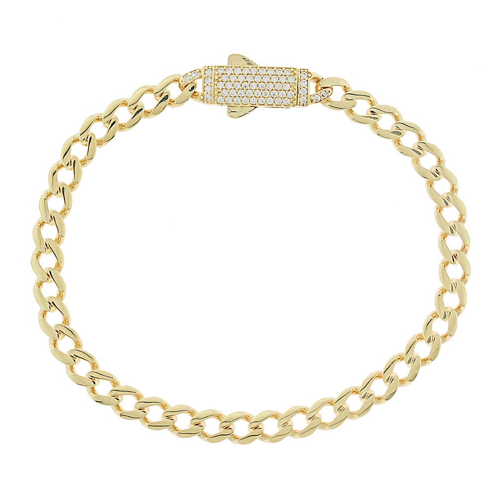 Ένα εντυπωσιακό χρυσό βραχιόλι Κ14 σε κλασική αλυσίδα τύπου “κουρδιστό”, ιδανικό για όσους αγαπούν τα στιβαρά και ταυτόχρονα εκλεπτυσμένα κοσμήματα. Η λαμπερή επιφάνειά του αντανακλά το φως με κάθε κίνηση, ενώ το κούμπωμα είναι διακοσμημένο με λαμπερά λευκά ζιργκόν, προσθέτοντας μια διακριτική πινελιά πολυτέλειας.