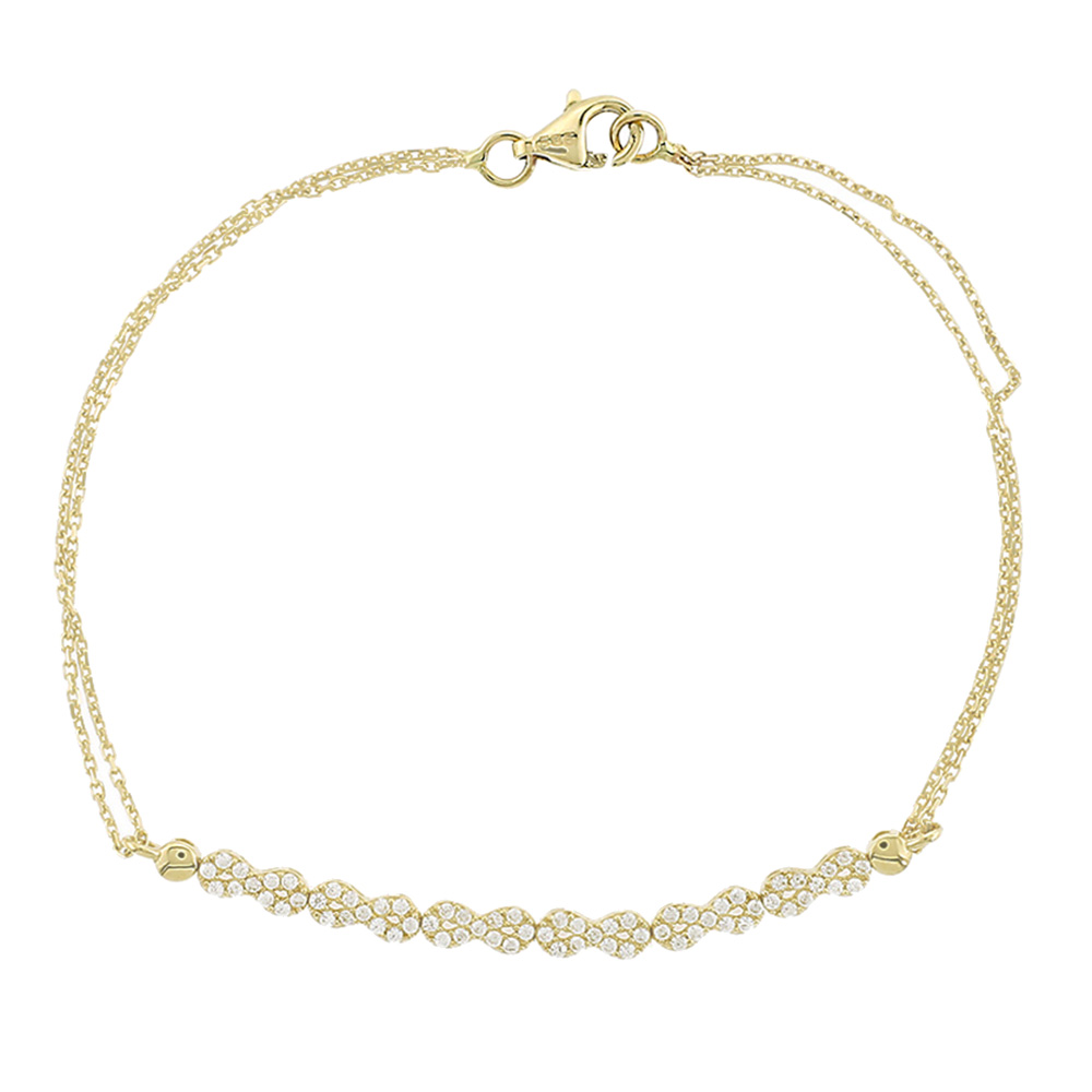 Εντυπωσιακό και διακριτικό βραχιόλι από χρυσό Κ14, διακοσμημένο με λαμπερά λευκά ζιργκόν τοποθετημένα σε κομψό κυματιστό μοτίβο. Η λεπτή διπλή αλυσίδα προσδίδει επιπλέον κομψότητα, ενώ το ασφαλές κούμπωμα τύπου lobster εξασφαλίζει άνετη και σταθερή εφαρμογή. Ένα εκλεπτυσμένο κόσμημα ιδανικό για καθημερινή λάμψη αλλά και για ιδιαίτερες εμφανίσεις.
