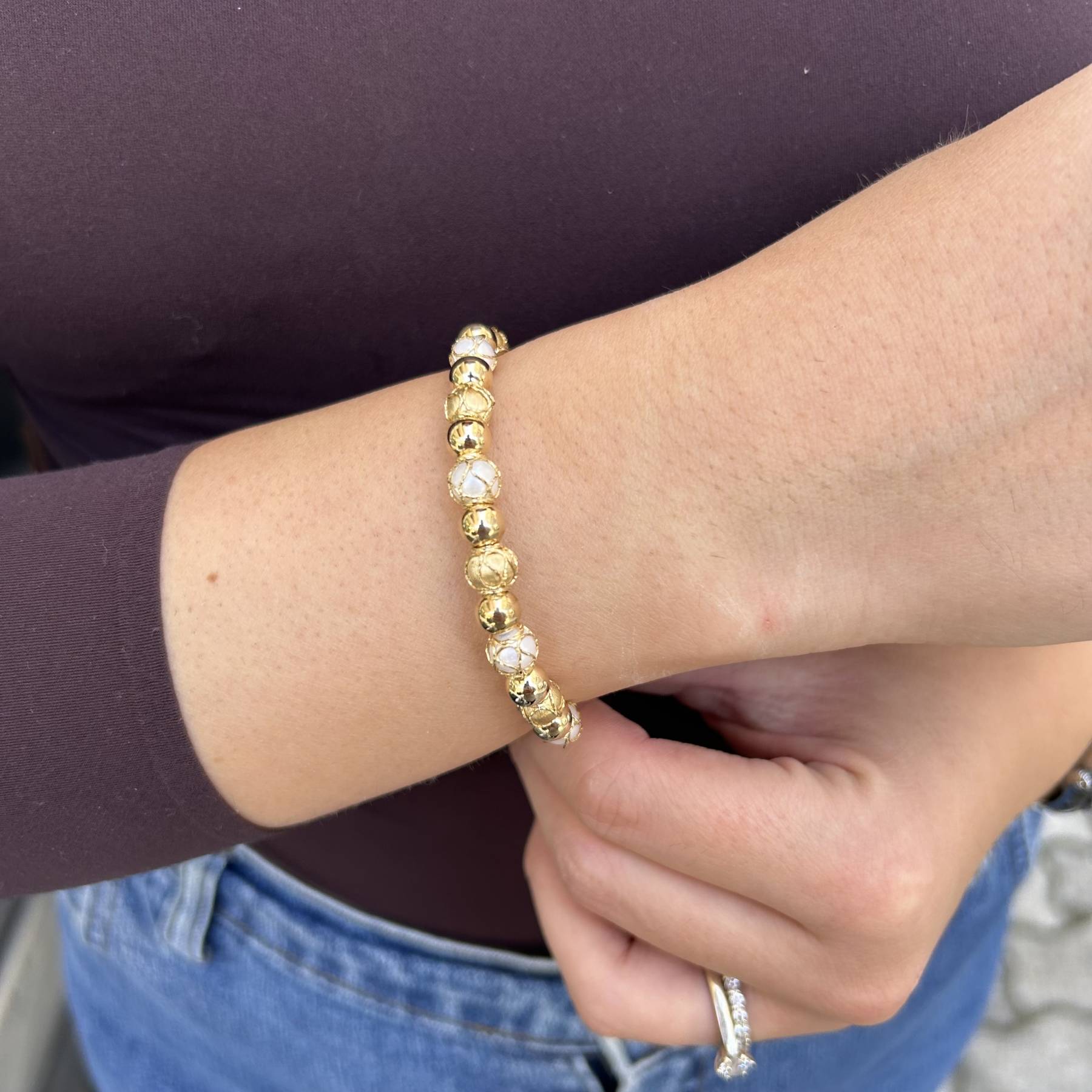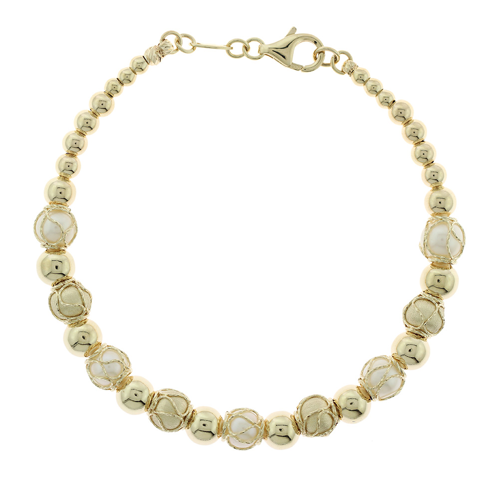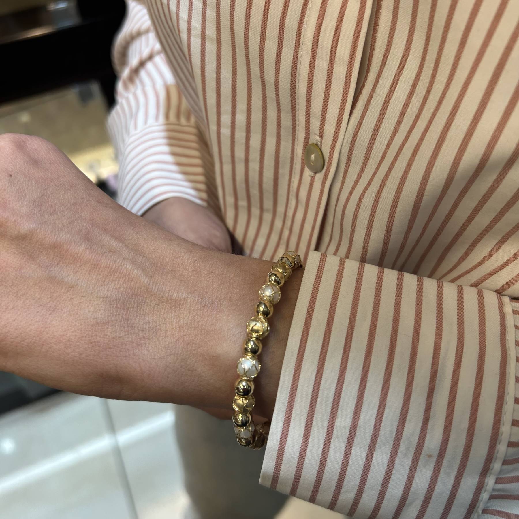 Αναδείξτε τη διαχρονική σας κομψότητα με αυτό το εντυπωσιακό βραχιόλι από χρυσό με μαργαριταρένιες λεπτομέρειες και λαμπερές σφαίρες. Ο συνδυασμός της γυαλιστερής υφής του μετάλλου με τη φίνα λάμψη των μαργαριταριών προσδίδει μια εκλεπτυσμένη και πολυτελή αισθητική.