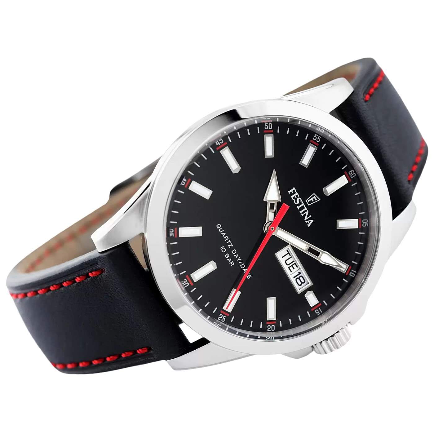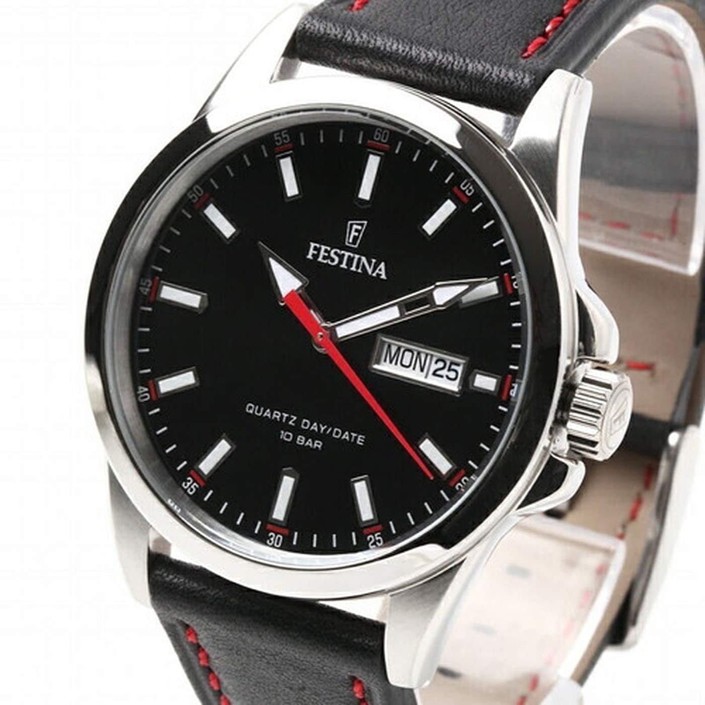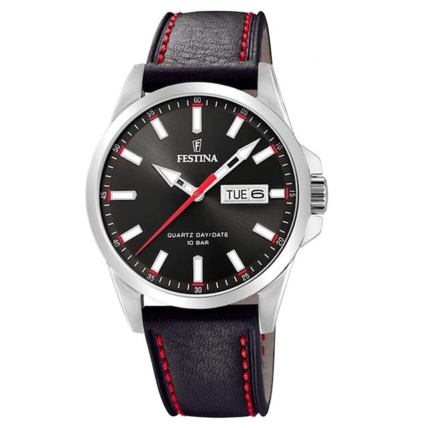Ανδρικό ρολόι Festina κατασκευασμένο από ανοξείδωτο ατσάλι με μαύρο δερμάτινο λουράκι και κόκκινο γαζί. Ένδειξη ημέρας, ημερομηνίας. Αδιάβροχο στα 100 μέτρα. ΕΓΓΥΗΣΗ: 2 έτη της επίσημης αντιπροσ