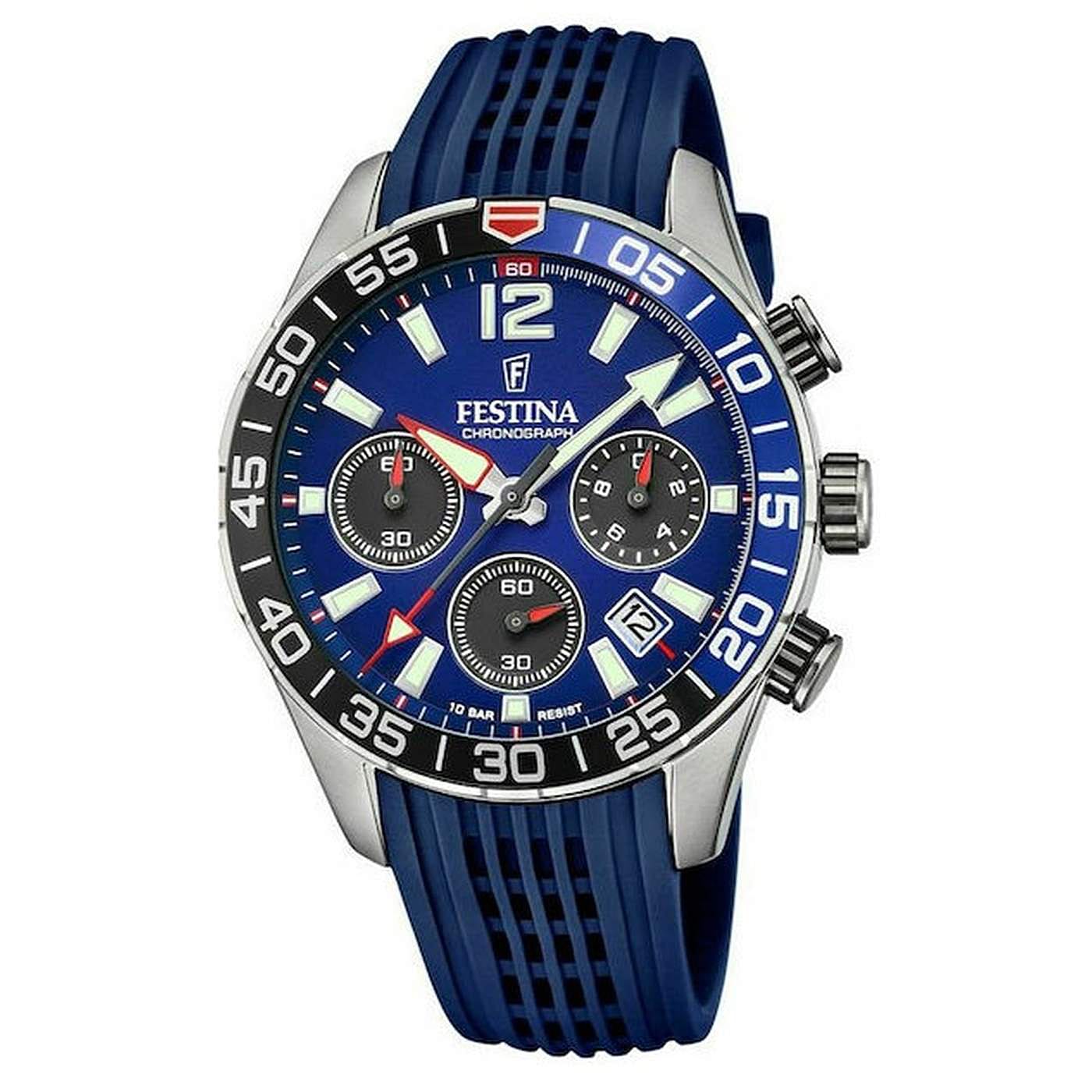 Ανδρικό ρολόι Festina κατασκευασμένο από ανοξείδωτο ατσάλι, μπλε καντράν με φωσφοριζέ στοιχεία. Χρονογράφος, Ένδειξη ημερομηνίας, 24ωρη ένδειξη βάση, αδιάβροχο στα 100 μέτρα. ΕΓΓΥΗΣΗ: 2 έτη της επίσημης αντιπροσωπείας της Festina. Δωρεάν έξοδα αποστολής και αντικαταβολής σε όλη την Ελλάδα.