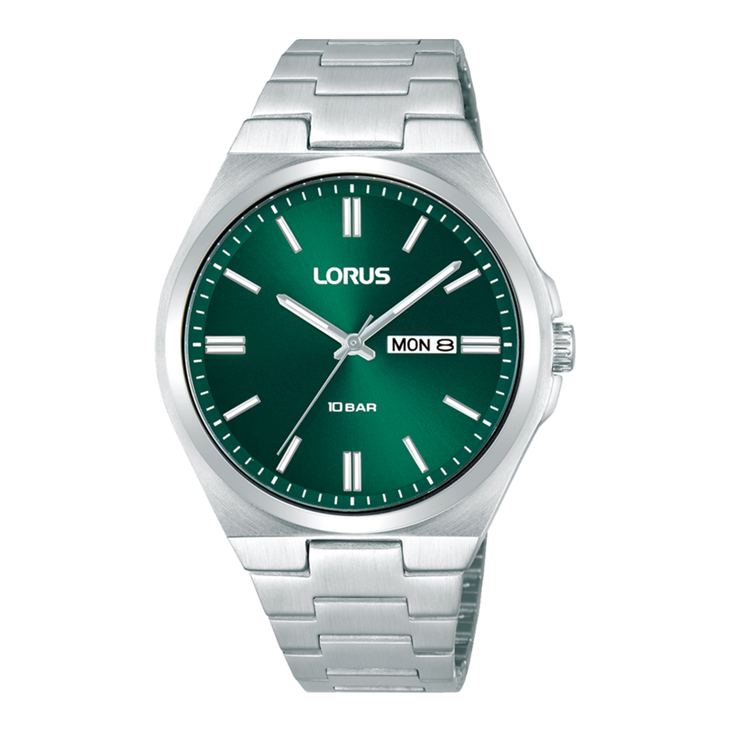 Ανδρικό ρολόι Lorus κατασκευασμένο από ανοξείδωτο ατσάλι με πράσινο καντράν και ασημί μπρασελέ.