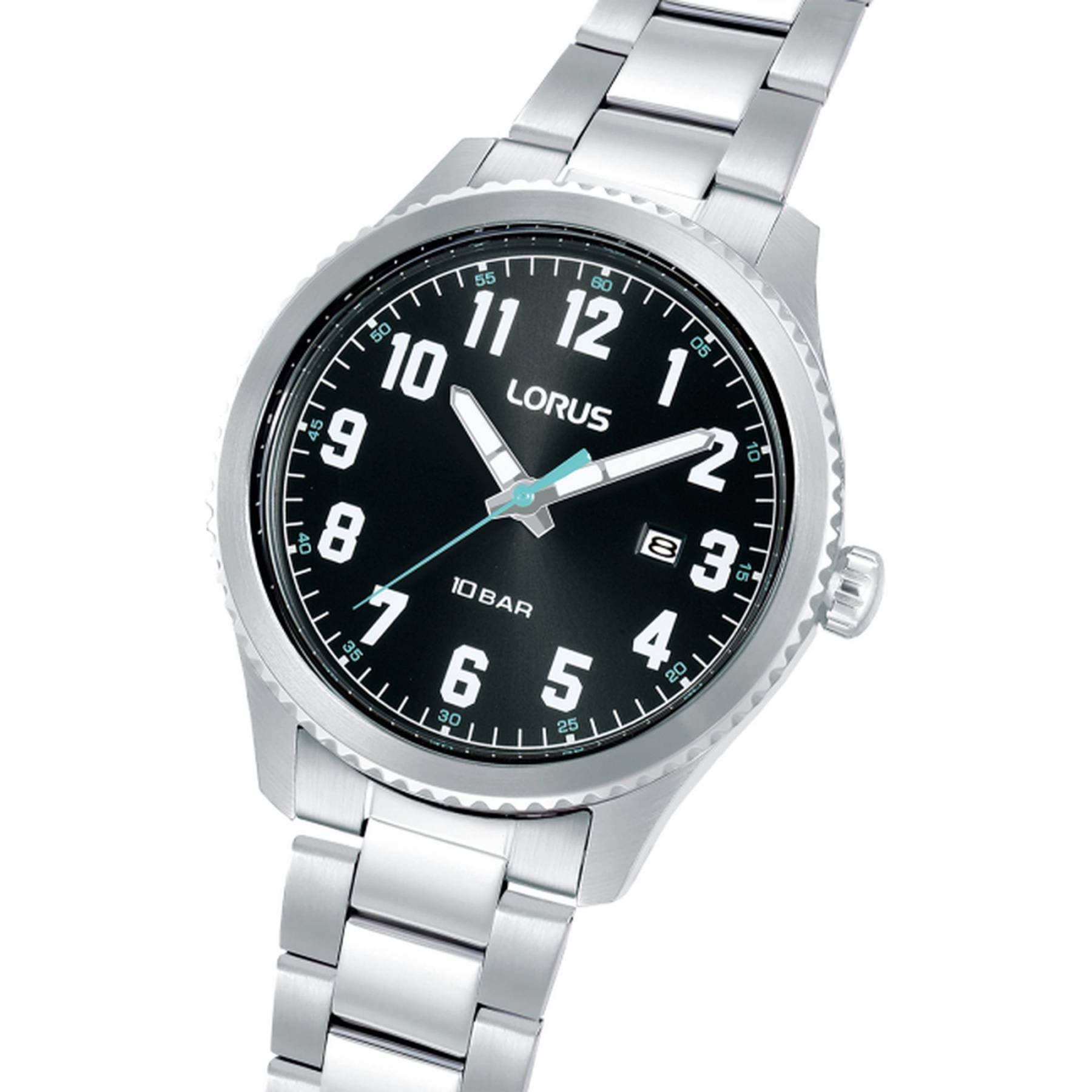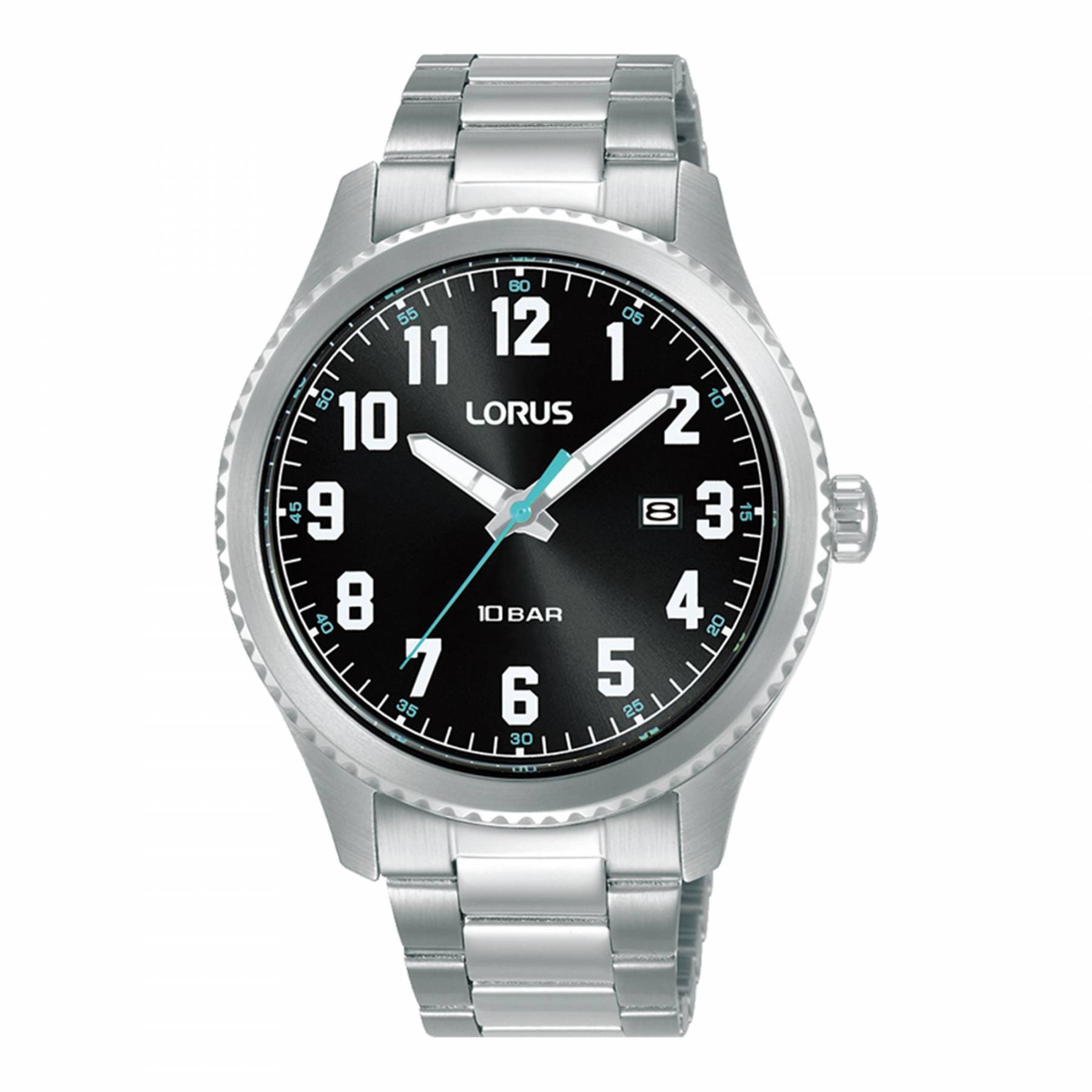 Ανδρικό ρολόι Lorus κατασκευασμένο από ανοξείδωτο ατσάλι με μαύρο καντράν και ασημί μπρασελέ.