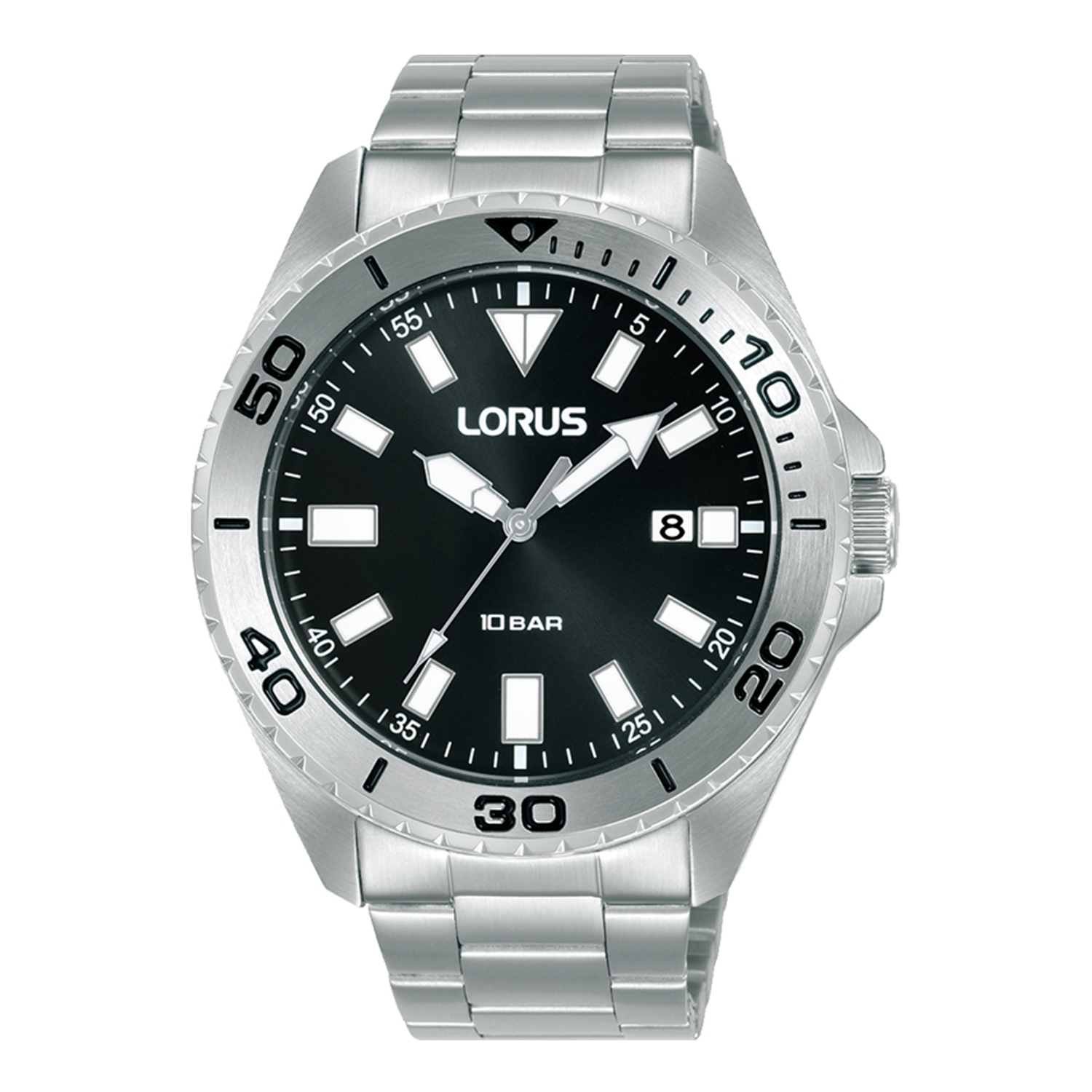 Ανδρικό ρολόι Lorus κατασκευασμένο από ανοξείδωτο ατσάλι με μαύρο καντράν και ασημί μπρασελέ.