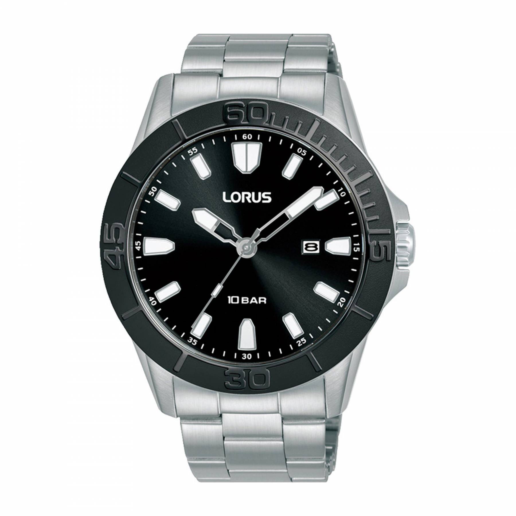 Ανδρικό ρολόι Lorus κατασκευασμένο από ανοξείδωτο ατσάλι με μαύρο καντράν και ασημί μπρασελέ.