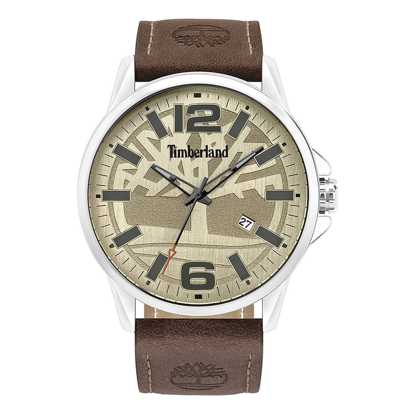 • Ανδρικό ρολόι Timberland με καφέ δερμάτινο λουράκι κάσα από ανοξείδωτο ατσάλι.