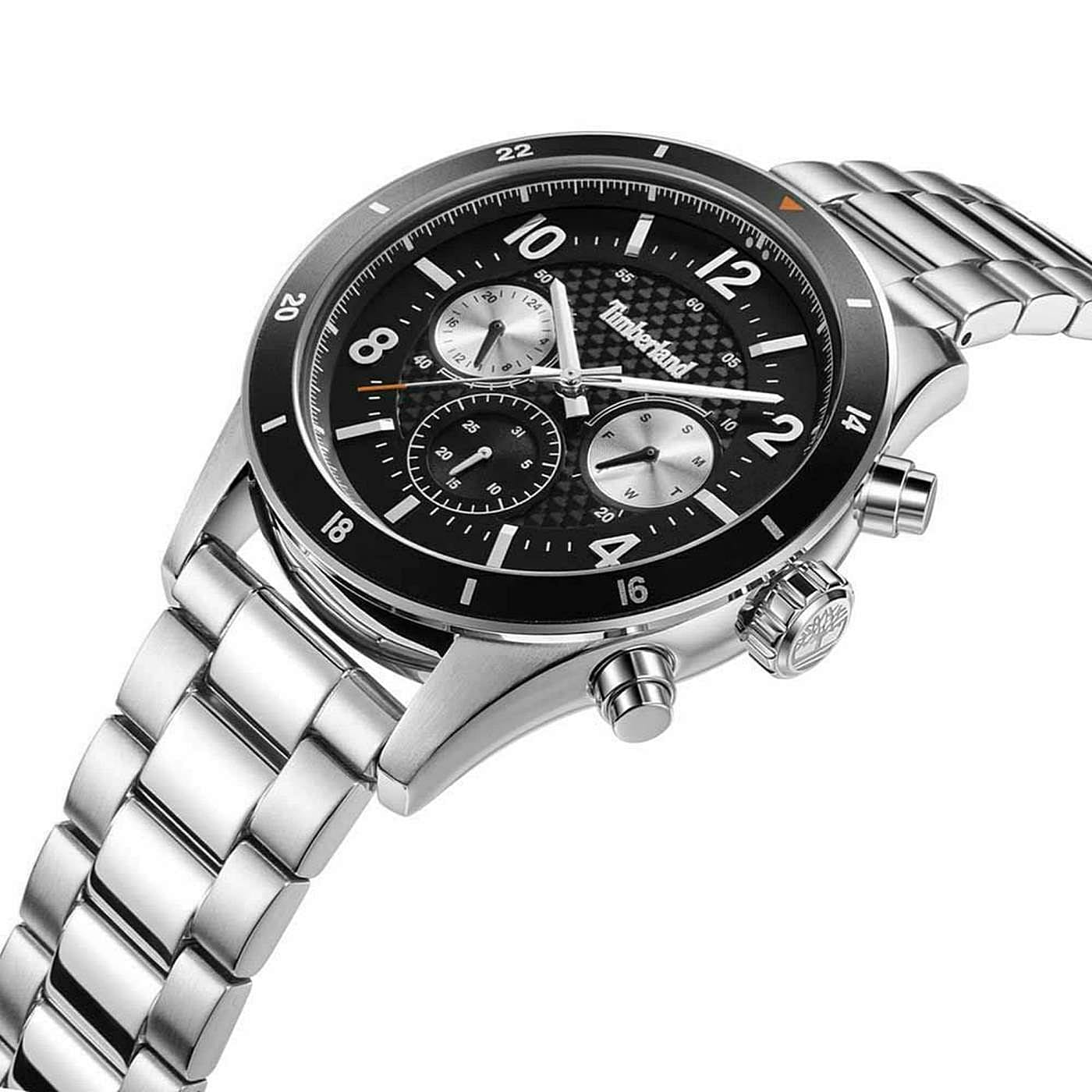 • Ανδρικό ρολόι Timberland με ασημί μεταλλικό μπρασελέ από ανοξείδωτο ατσάλι.