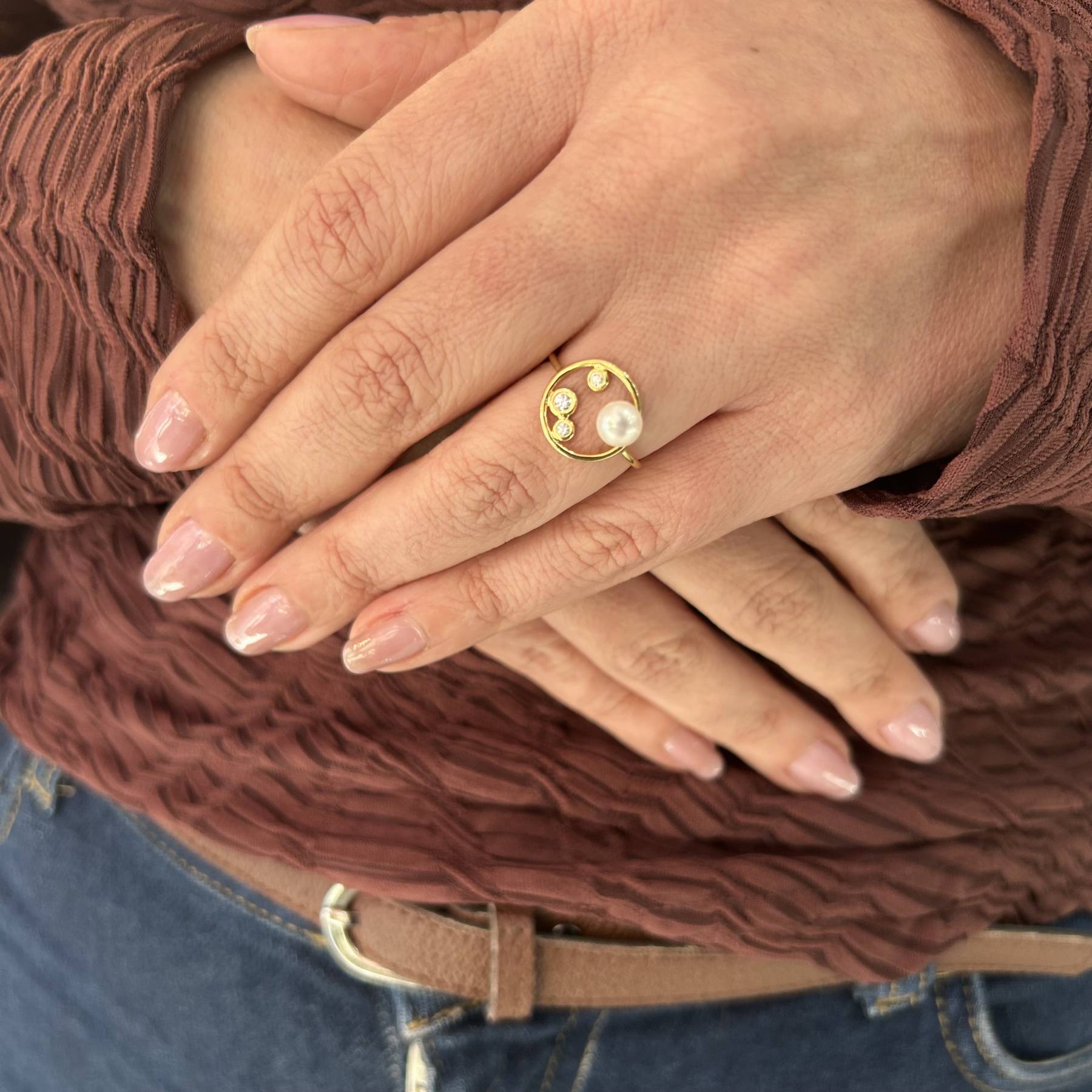 Δαχτυλίδι από κίτρινο Χρυσό 14 καρατίων, στολισμένο με μαργαριτάρι και διαμάντια Diw:0.07ct