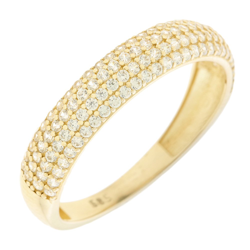 Αυτό το δαχτυλίδι είναι ένα πολυτελές και λαμπερό χρυσό κόσμημα 14 καρατίων (585), διακοσμημένο με πολλαπλές σειρές από πέτρες ζιργκόν.
