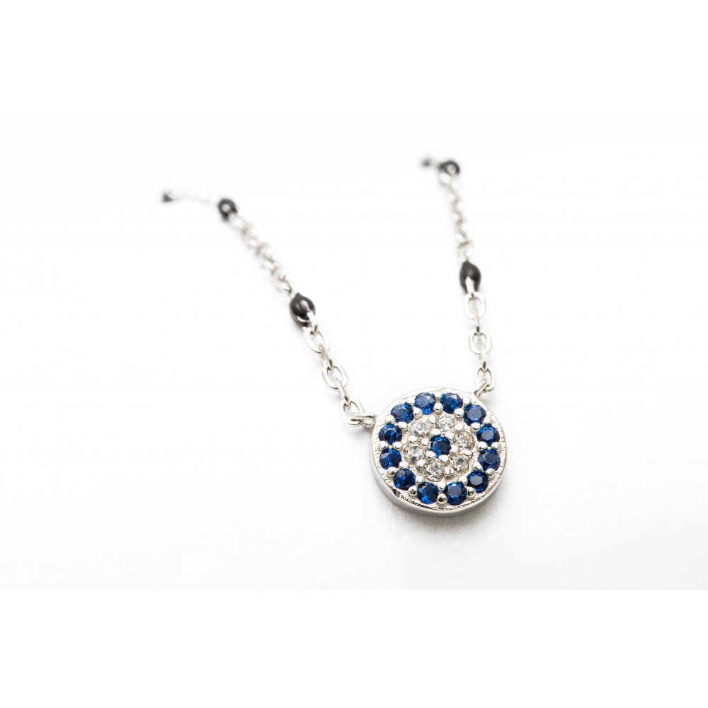 Ασημένιο κολιέ σε λευκό χρώμα με ματάκι και πέτρες ζιργκόν.