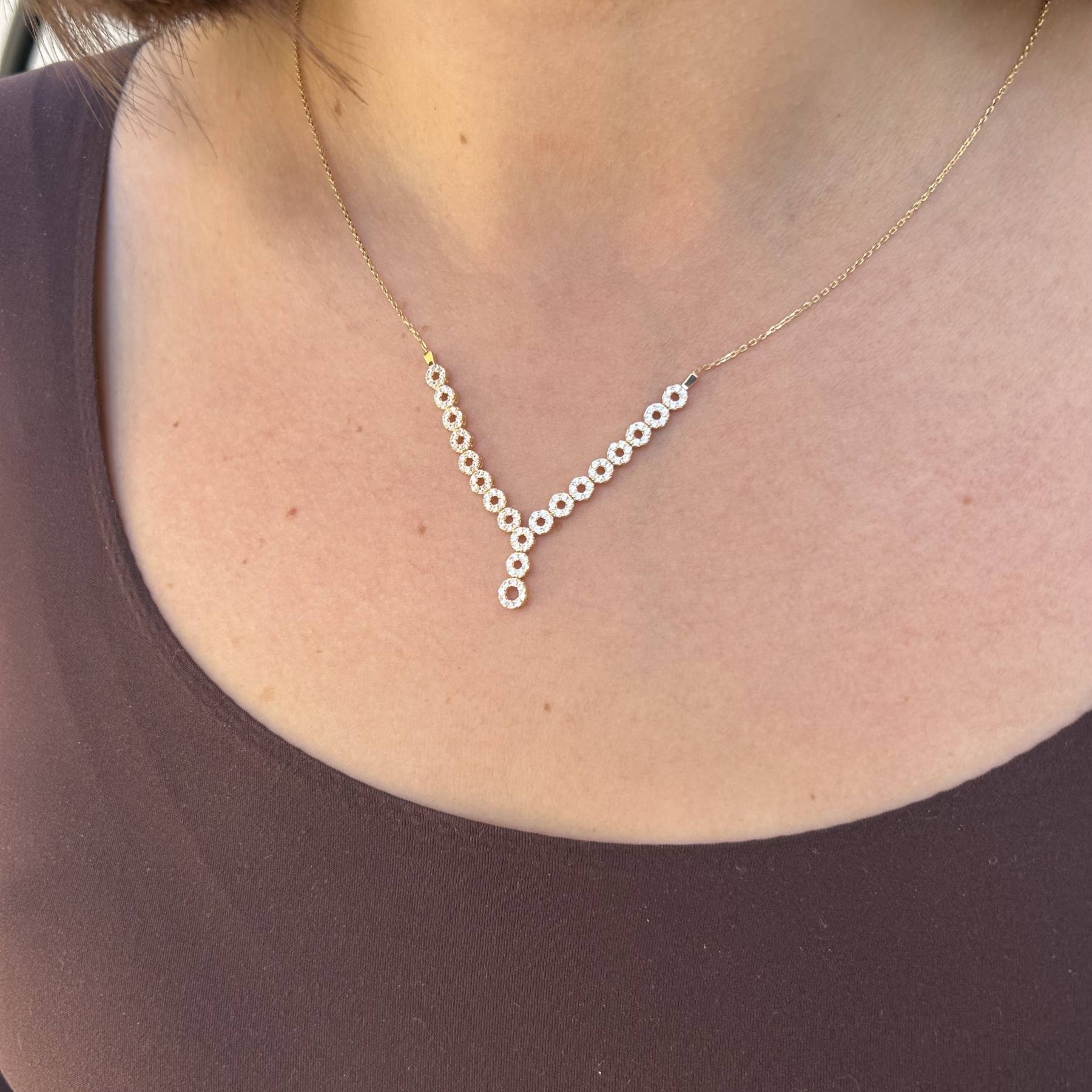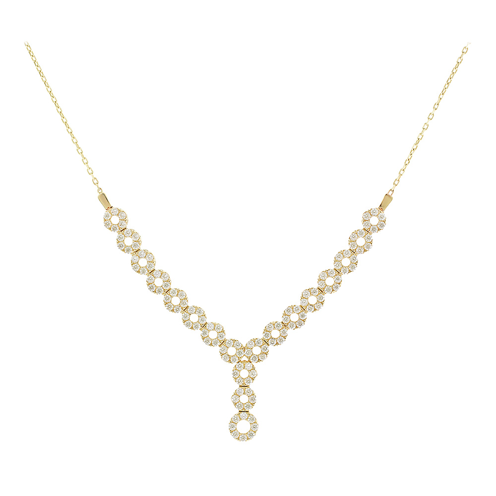 Αναδείξτε την κομψότητα και τη λάμψη σας με αυτό το εντυπωσιακό χρυσό κολιέ διακοσμημένο με λαμπερές λευκές πέτρες ζιργκόν. Το μοναδικό του σχέδιο με συνδεδεμένους κύκλους δημιουργεί ένα εκλεπτυσμένο “V” σχήμα που χαρίζει φως και πολυτέλεια σε κάθε εμφάνιση.