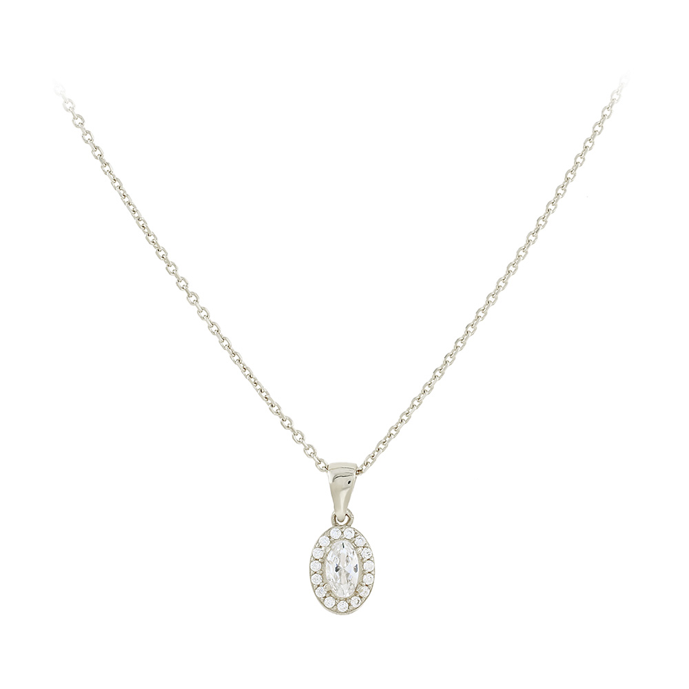 Απογειώστε την κομψότητά σας με αυτό το λαμπερό μενταγιόν από λευκό χρυσό 14 καρατίων, διακοσμημένο με εκθαμβωτικά ζιργκόν. Το εντυπωσιακό κεντρικό ζιργκόν σε οβάλ σχήμα περιβάλλεται από μια σειρά μικρότερων πετρών που χαρίζουν απίστευτη λάμψη σε κάθε σας εμφάνιση.