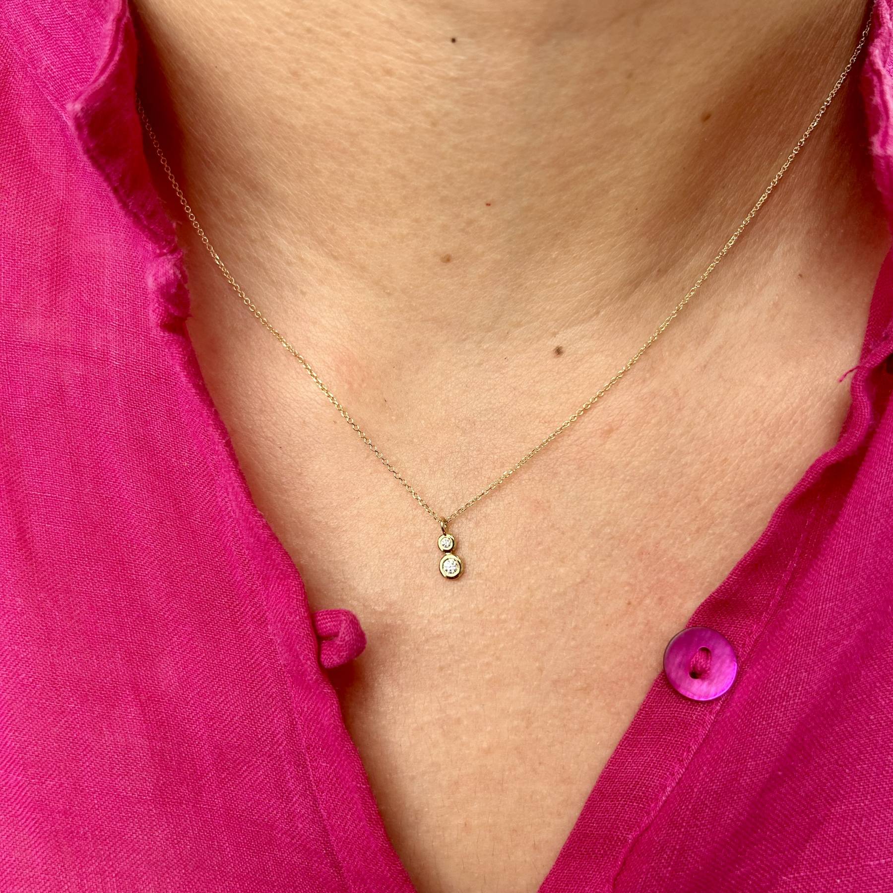 Αυτό είναι ένα εκλεπτυσμένο και κομψό κολιέ από χρυσό 14 καρατίων, το οποίο διακρίνεται για τη διαχρονική του αισθητική. Το κεντρικό στοιχείο αποτελείται από 2 διαμάντια σε γραμμική διάταξη, τοποθετημένα μέσα σε λείες κυκλικές βάσεις (bezel setting), δημιουργώντας μία αίσθηση αρμονίας και ισορροπίας. Η λεπτή και στιβαρή αλυσίδα ολοκληρώνει το διακριτικό αυτό κόσμημα, καθιστώντας το ιδανικό για κάθε ώρα της ημέρας αλλά και για πιο ιδιαίτερες περιστάσεις. Ένα κομμάτι που αποπνέει πολυτέλεια μέσα από την απλότητά του.Η αλυσίδα έχει μήκος 42cm.