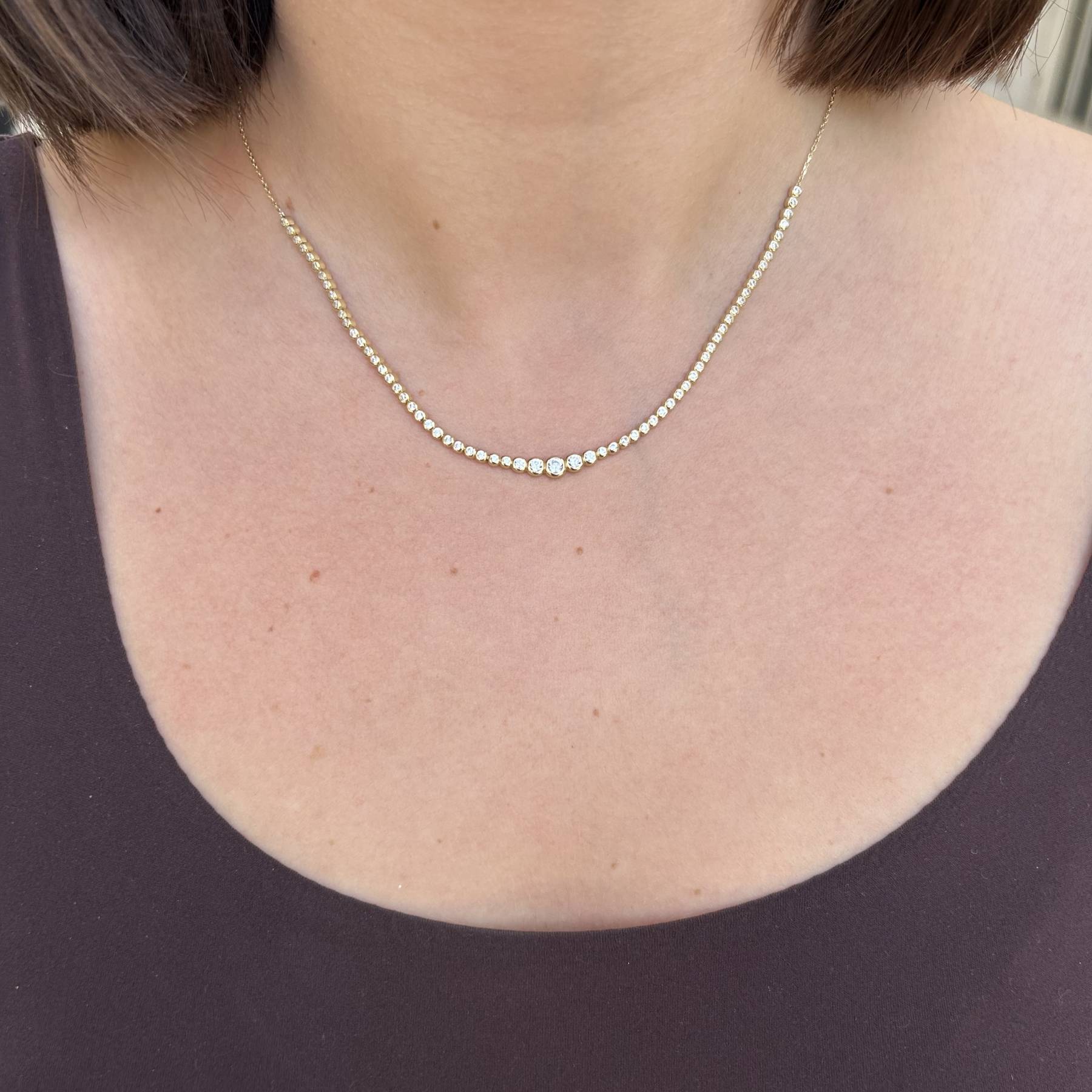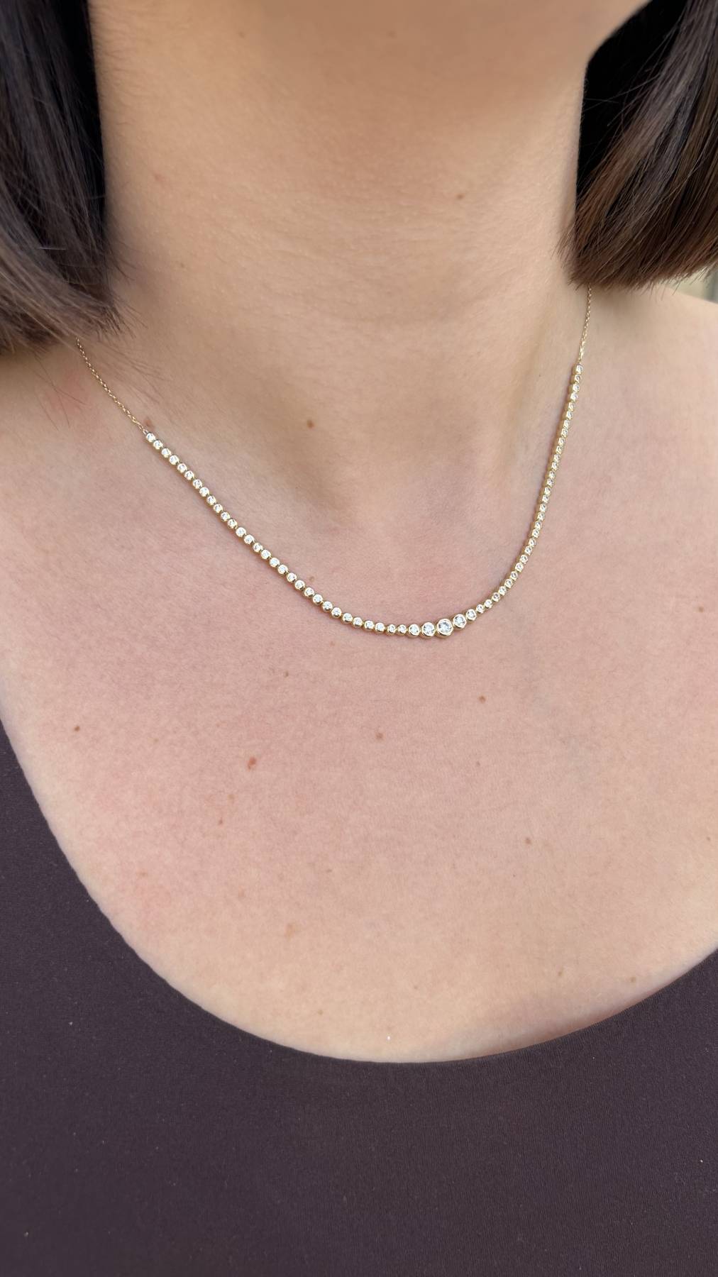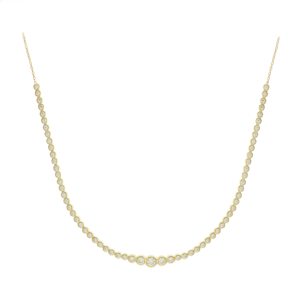 Αναβαθμίστε κάθε σας εμφάνιση με αυτό το διαχρονικό κολιέ από χρυσό Κ14, στολισμένο με μία σειρά από λαμπερά ζιργκόν σε περιμετρική (bezel-style) τοποθέτηση. Η συμμετρική διάταξη των λίθων που μικραίνουν ομαλά προς τα άκρα χαρίζει κομψότητα, αρμονία και πολυτέλεια. Ένα κόσμημα που συνδυάζεται εύκολα τόσο με βραδινές όσο και με καθημερινές εμφανίσεις, προσφέροντας διακριτική αλλά εντυπωσιακή λάμψη.
