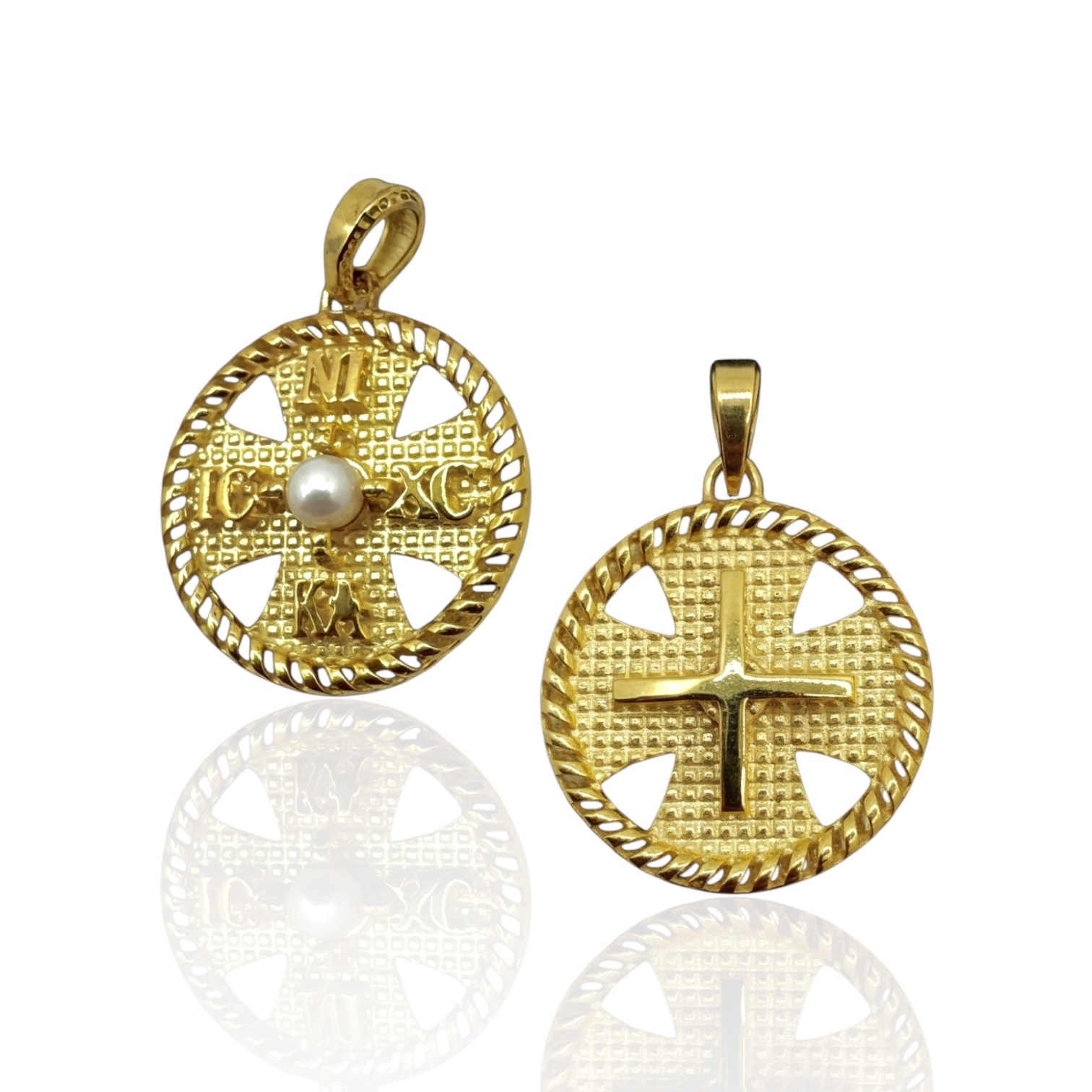 Αναδείξτε την πίστη και το προσωπικό σας στυλ με αυτό το εντυπωσιακό χρυσό μενταγιόν IC XC NIKA. Το μενταγιόν διαθέτει στρογγυλό σχέδιο με λεπτομερή ανάγλυφη υφή και λαμπερό σταυρό στο κέντρο, στολισμένο με μαργαριτάρι.