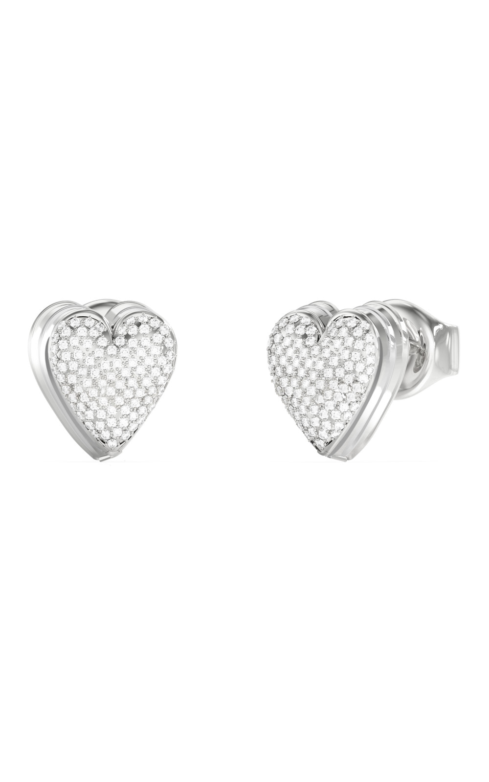 Γυναικεία σκουλαρίκια GUESS STEEL, ασημένια με σχέδιο καρδιές, πέτρες και λογότυπο (0,8cm).