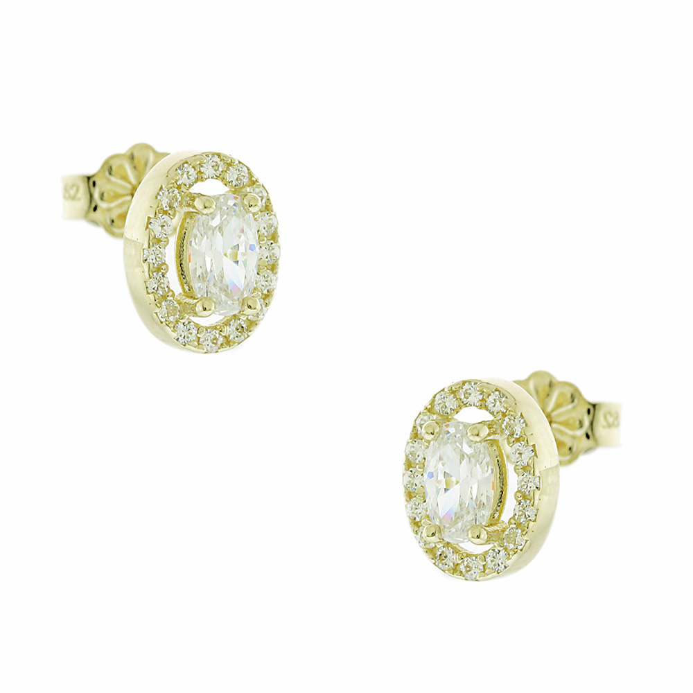 Χρυσά Σκουλαρίκια Καρφάκια με Οβάλ Λευκή Πέτρα & Πέτρες Ζιργκόν